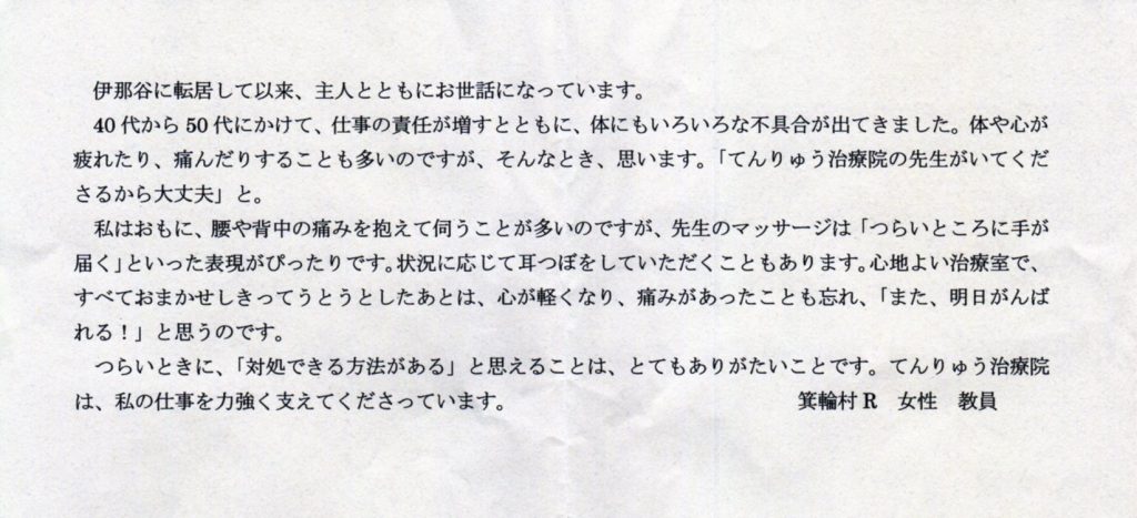 私の仕事を力強く支えてくださっています 腰痛 伊那谷に転居して以来、主人とともにお世話になっています。40代から50代にかけて、仕事の責任が増すとともに、体にもいろいろな不具合が出てきました。体や心が疲れたり、痛んだりすることも多いのですが、そんなとき、思います。「てんりゅう治療院の先生がいてくださるから大丈夫」と。 私はおもに、腰や背中の痛みを抱えて伺うことが多いのですが、先生のマッサージは「つらいところに手が届くJといった表現がぴったりです。状況に応じて耳つぼをしていただくこともあります。心地よい治療室で、すべておまかせしきってうとうとしたあとは、心が軽くなり、痛みがあったことも忘れ、「また、明日がんばれる! 」と思うのです。つらいときに、「対処できる方法がある」と思えることは、とてもありがたいことです。てんりゅう治療院は、私の仕事を力強く支えてくださっています。 南箕輪村Rさん 女性 教員 ※個人の感想であり、施術の効果には個人差があります。